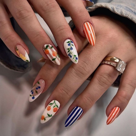 one order for citrus nails please! citrus oranges and lemons nails for all. one nail is blueberry for a stripe twist. citrus reminds us to start the day with success. remember the lord in everything you do and he will give you success.