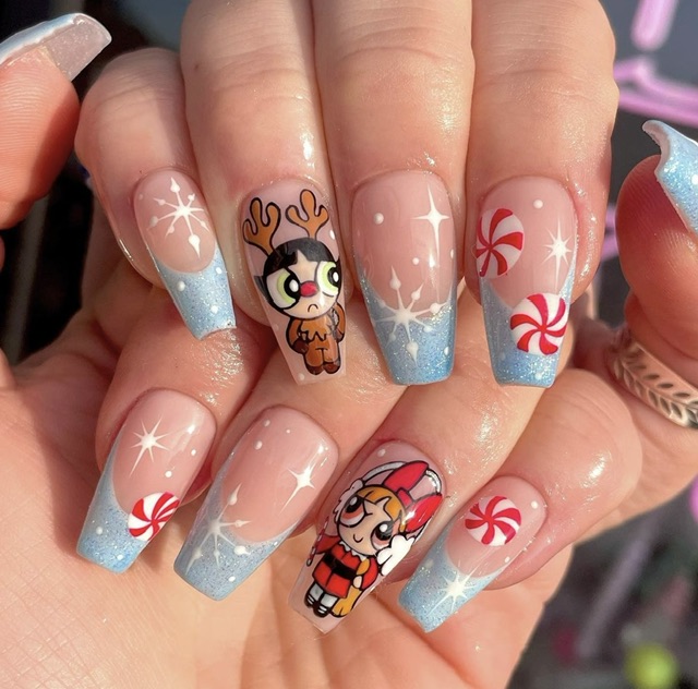 Ice blue french with peppermint, Blossom and buttercup is wearing reindeer ears.